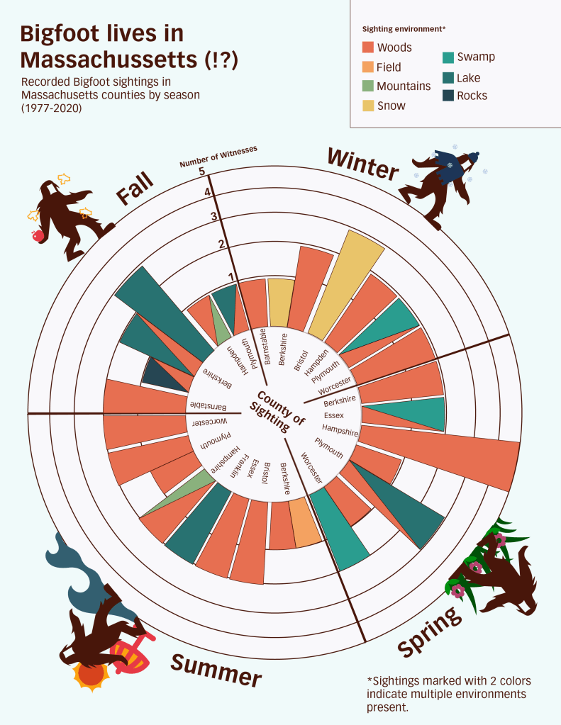 This radial chart uses data from the Bigfoot Field Researchers Organization to document recorded Bigfoot sightings in Massachusetts from 1977 onwards. Designed in d3.js and Adobe Illustrator.