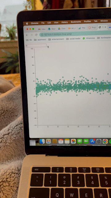 A scatterplot proved much more successful, as I was able to make something that did not look “like a worm” pretty quickly. I was able to make it such that a user hovering their cursor on a point would be able to see some copy about that particular school’s friending bias. Ideally, I would have been able to include the school name, but unfortunately did not have that column in the dataset. Upon some reading and reflection, I realized that I needed to implement some kind of zoom functionality into my visualization, since I had many overlapping datapoints, and if I expected users to hover, I needed to give them the option to filter out some of the data on their end. I decided on an x-axis zoom, where users can input the limit of the x-axis they want to see, since brushing would also interfere with the hovering.