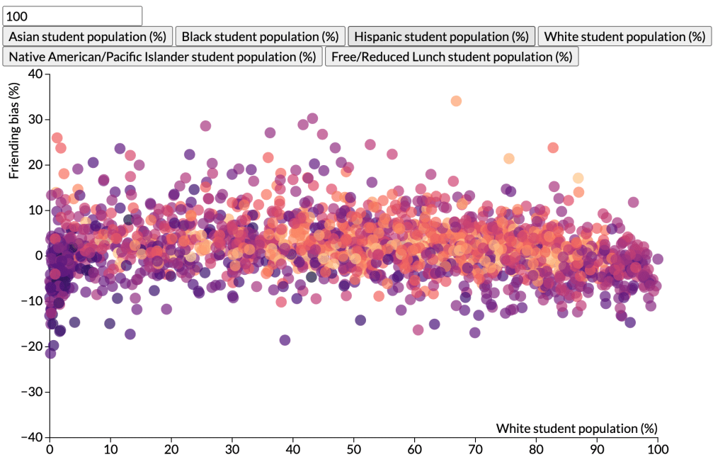 For my final project in d3 for VisTech I, completed at Northeastern University for my M.S. in Information Design & Data Visualization, I decided to use data from research I’ve been working on as a research assistant with the Plural Connections lab, which looks at factors affecting economic mobility and social capital in U.S. public schools. On the one hand, I already had the data downloaded and was familiar with the variables. On the other, I was excited to see how I could put this data that I was already familiar with in a statistical setting to use in a dynamic visualization setting. Since the research I’ve been helping out with is still ongoing, I did not want to create a tool that pointed to any definitive conclusion, but rather an exploratory tool that allows audiences to take a look at how different factors affect friending bias.